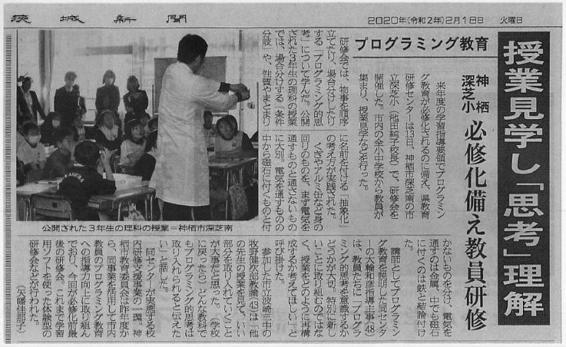 2月13日(木)に行われた,神栖市教育委員会の依頼による校内研修支援訪問(会場:神栖市立深芝小学校)の様子が,2020年2月18日付茨城新聞で紹介されました。研修のテーマは「プログラミング教育」です。神栖市は,市を挙げて来年度以降のプログラミング教育の準備を進めており,今回は昨年度から継続して6度目の訪問になります。市内全ての小中学校の参加者が授業を参観し,研究協議を行いました。市教育委員会が中心となり,小中連携した神栖市の取組は,これからプログラミング教育をどのように進めていけばよいか検討中の市町村にとって参考になるのではないかと思います。